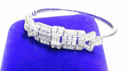 Art Deco Style Emearld Round and Baguette Diamond Bracelet Bangle 14k White Gold