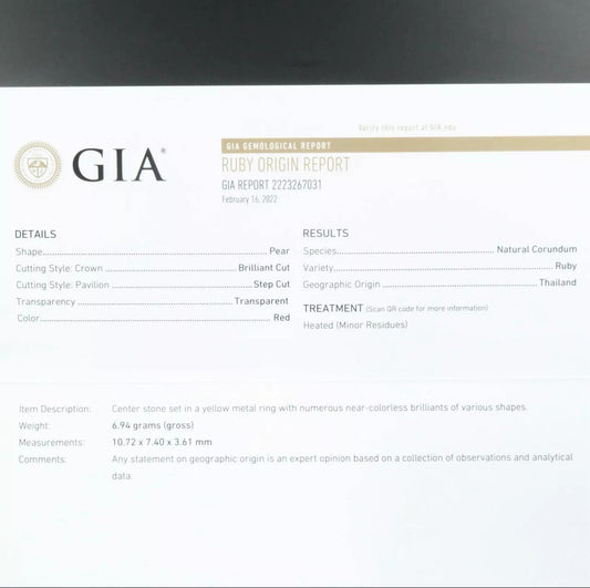Estate 18k Gold 3.75 CTs Pear Shape Thai Ruby And VS Diamond Ring GIA CERTIFIED