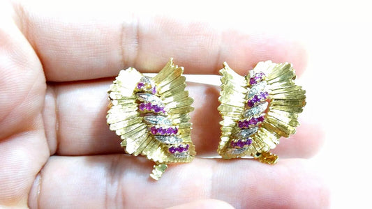 Estate Floral Cocktail Ruby Diamond Huggies Earrings 18k Yellow Gold Clip On