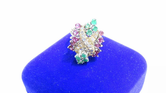 Estate Cocktail 14k White Gold 2.05 CT Natural Emerald Ruby And Diamond Ring