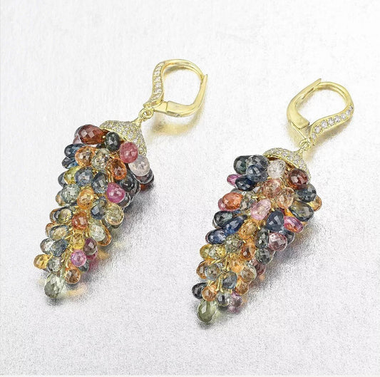 Estate 18k Yellow Gold 97.68 CTs Multicolor Sapphire Diamond Grape Earring
