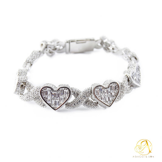 12MM 7.5-Inch Sterling Silver Heart Bracelet with White A5 Stones – Rhodium Plated, 33.78g
