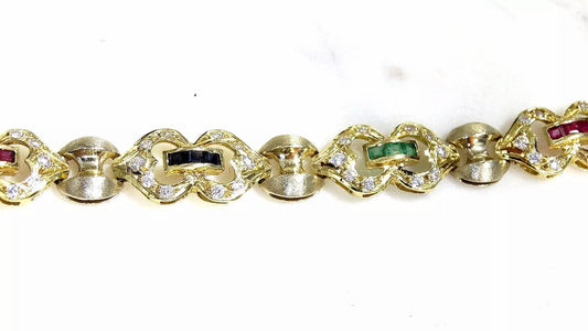 Vintage Fine 18K Yellow Gold 1.75 ct TW Ruby Emerald Sapphire Diamond Bracelet