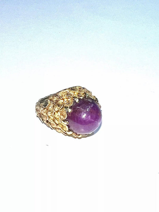 Vintage 12.98 CTs Star Ruby Cabochon Ring Set On 18k Yellow Gold Leaf Ring