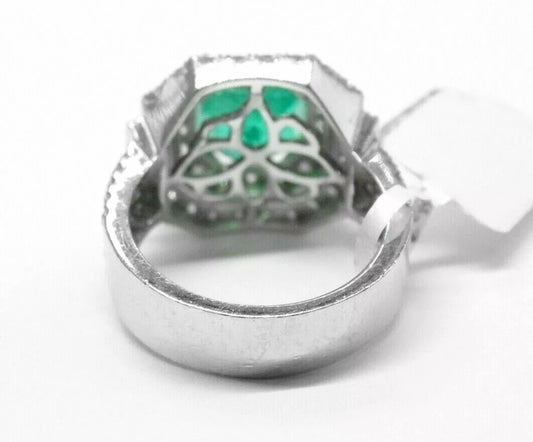 Fine 14K White Gold Cushion Cut Columbian Emerald VS Diamond Engagement Ring
