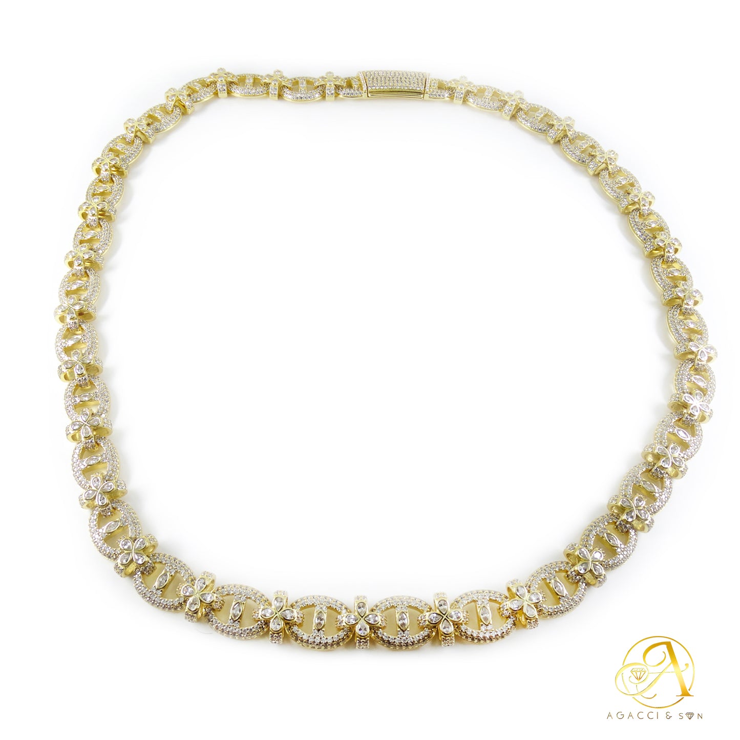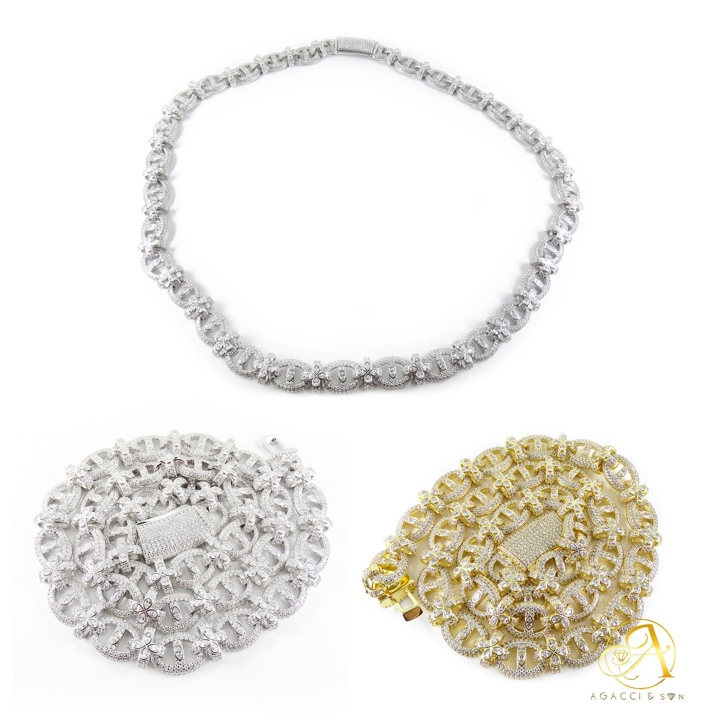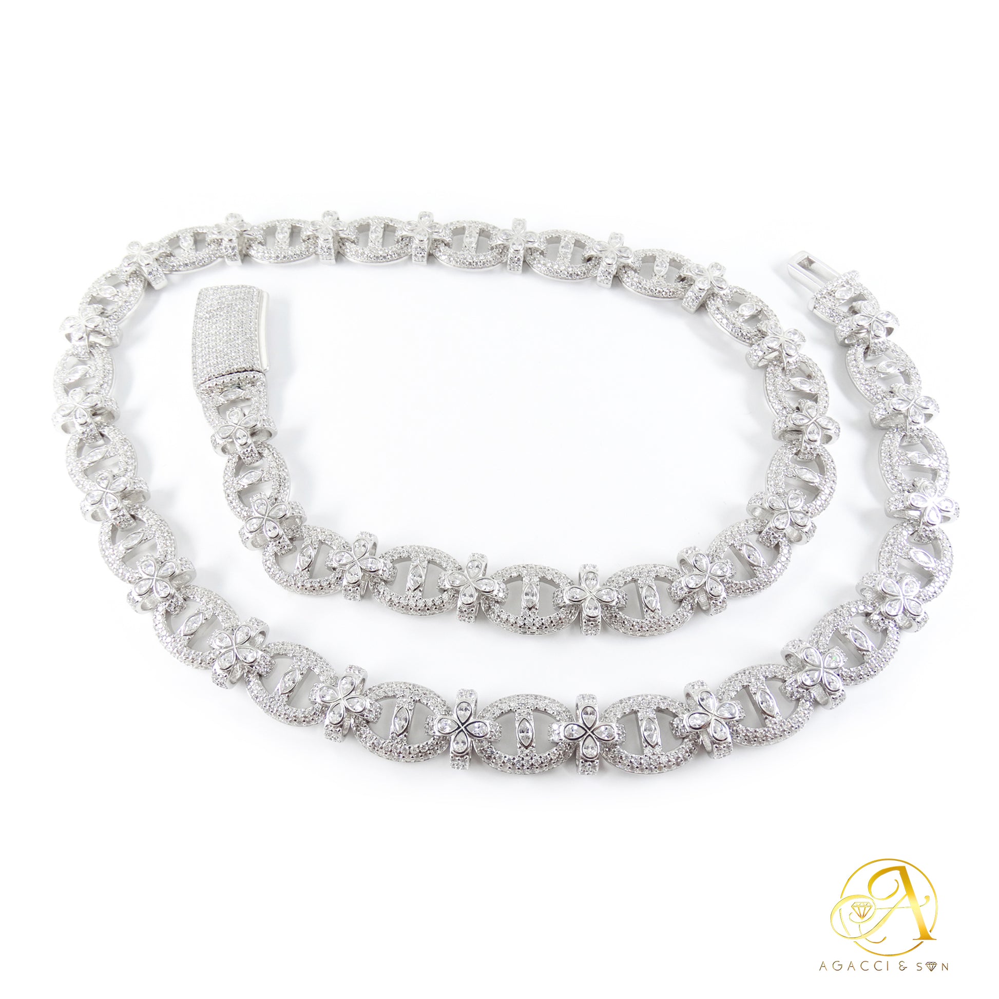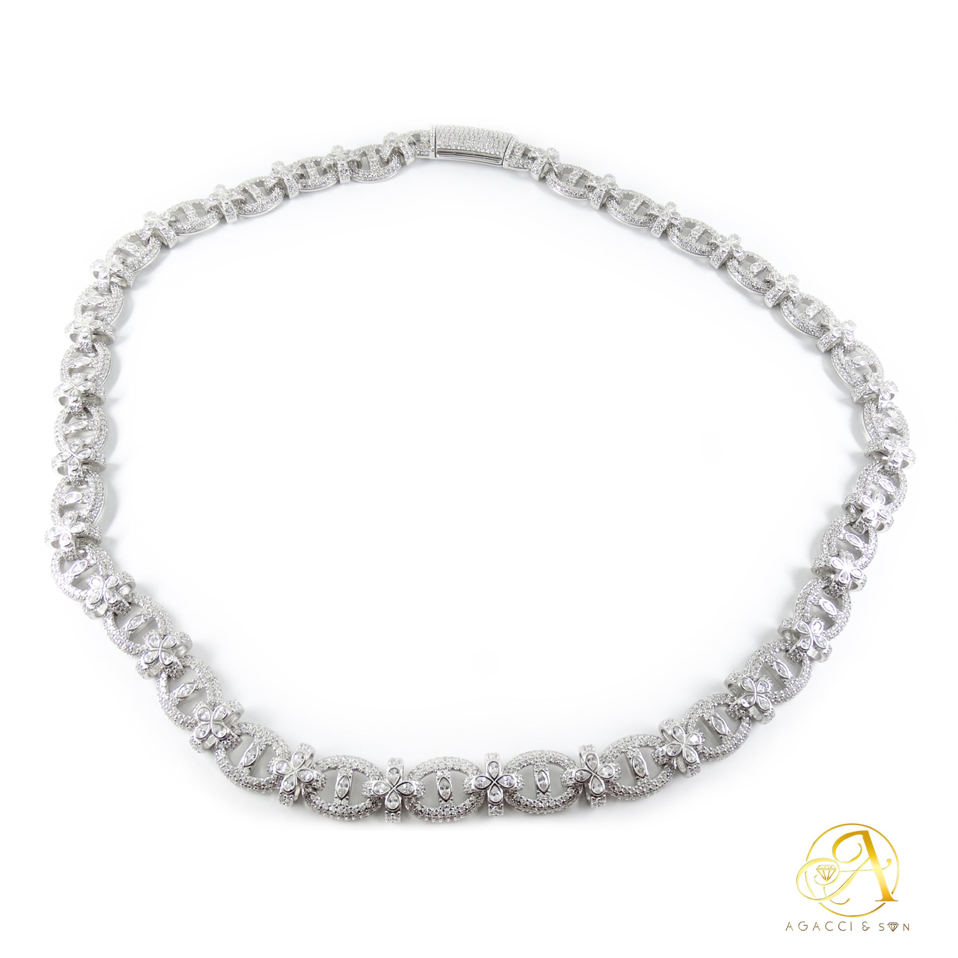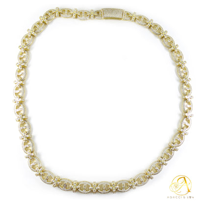 12MM Gold & Silver CZ Necklace – White A5 Stones, Floral-Inspired Design