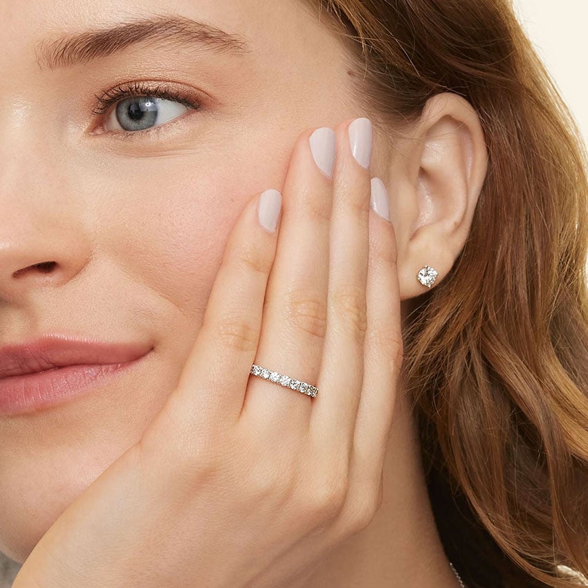 This luminous band features a row of diamonds extending halfway down the shank in a French pavé setting style that allows light to reach the diamonds from multiple angles and enhances their sparkle.