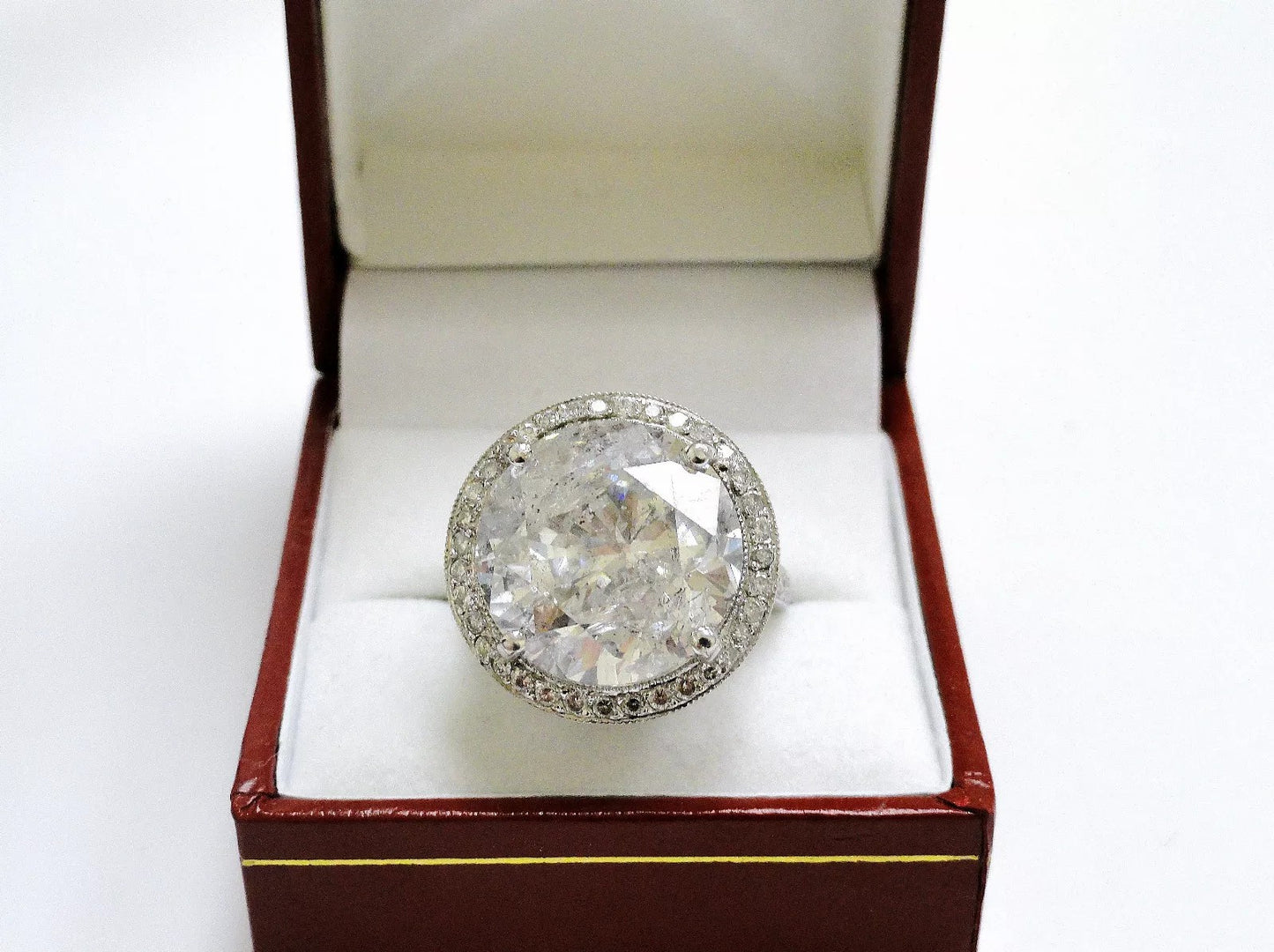 Indulge in the ultimate luxury with this Exquisite 18K White Gold Diamond Engagement Ring, a true masterpiece of fine jewelry. Featuring a breathtaking 15.12-carat round brilliant center diamond surrounded by 2.70 carats of smaller round brilliant diamonds, this ring is a dazzling display of brilliance and craftsmanship. Perfect for engagements, anniversaries, or as a statement piece, this ring is a true symbol of everlasting love and commitment.