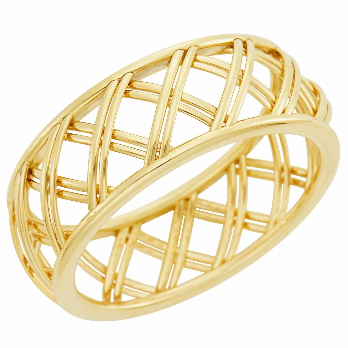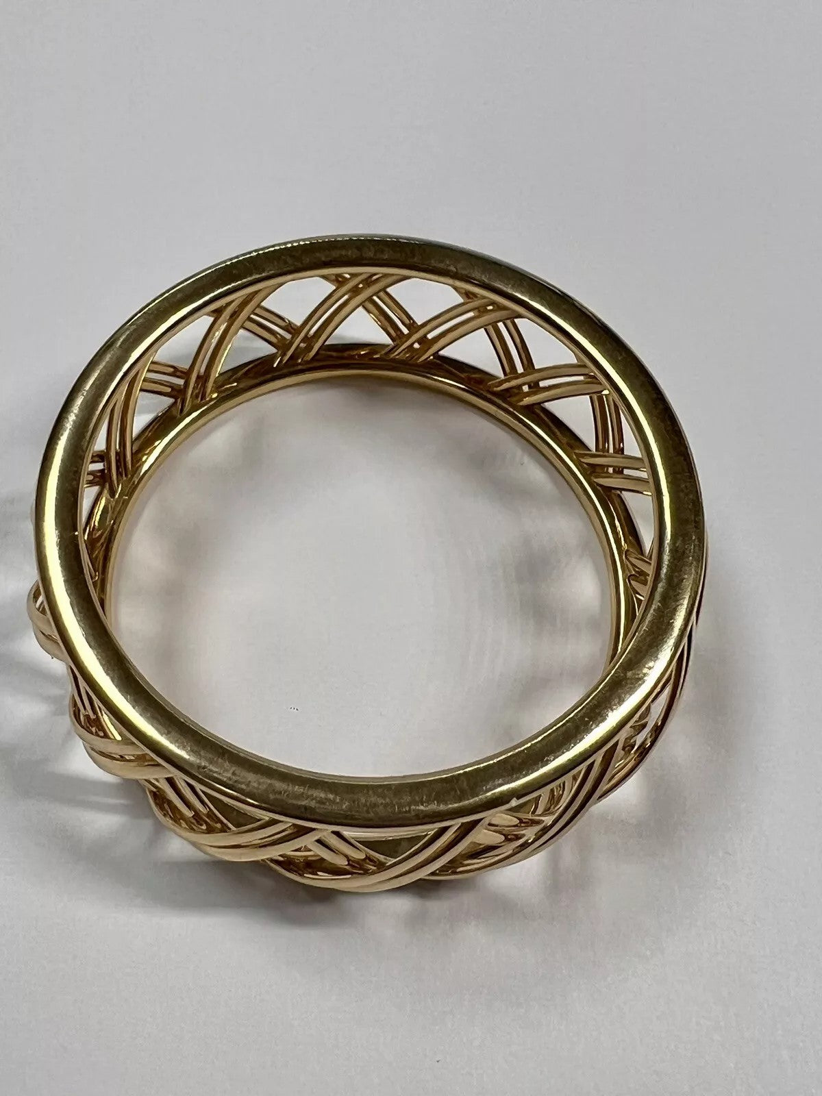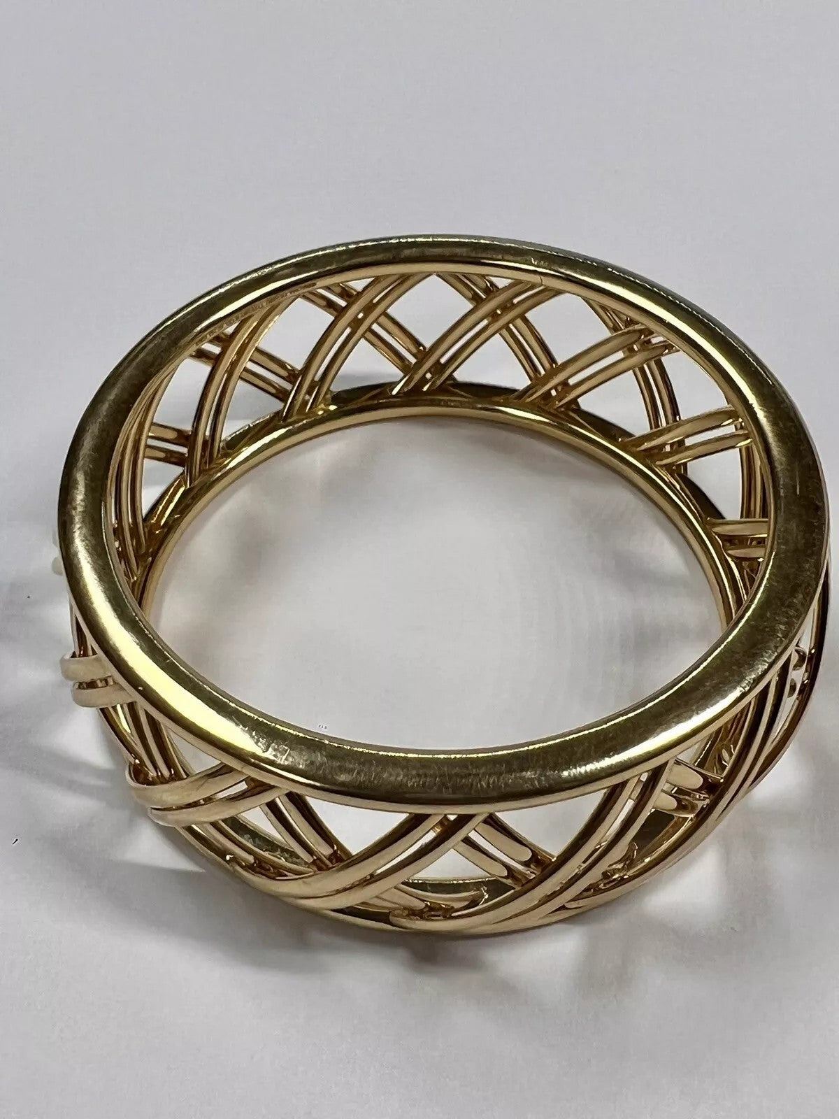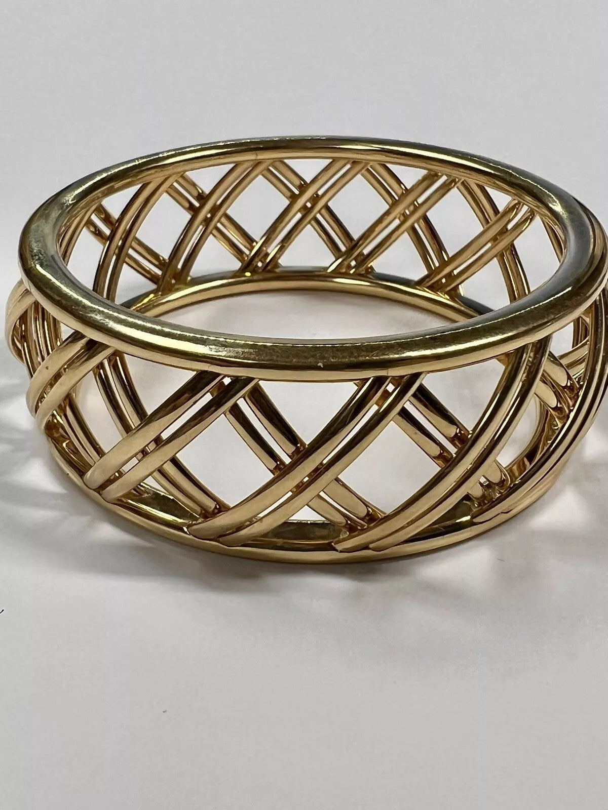 Design: This bangle showcases a bold trellis design, with crisscrossing bands edged by polished gold, creating a striking and sophisticated look.